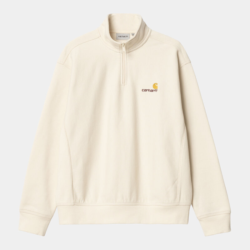The Half Zip American Script Sweatshirt is constructed from a 12.3 oz cotton-polyester blend and brushed for extra softness and warmth, without losing breathability. The garment features a highneck with a zipper and a small logo. Appears in a loose, boxy silhouette.